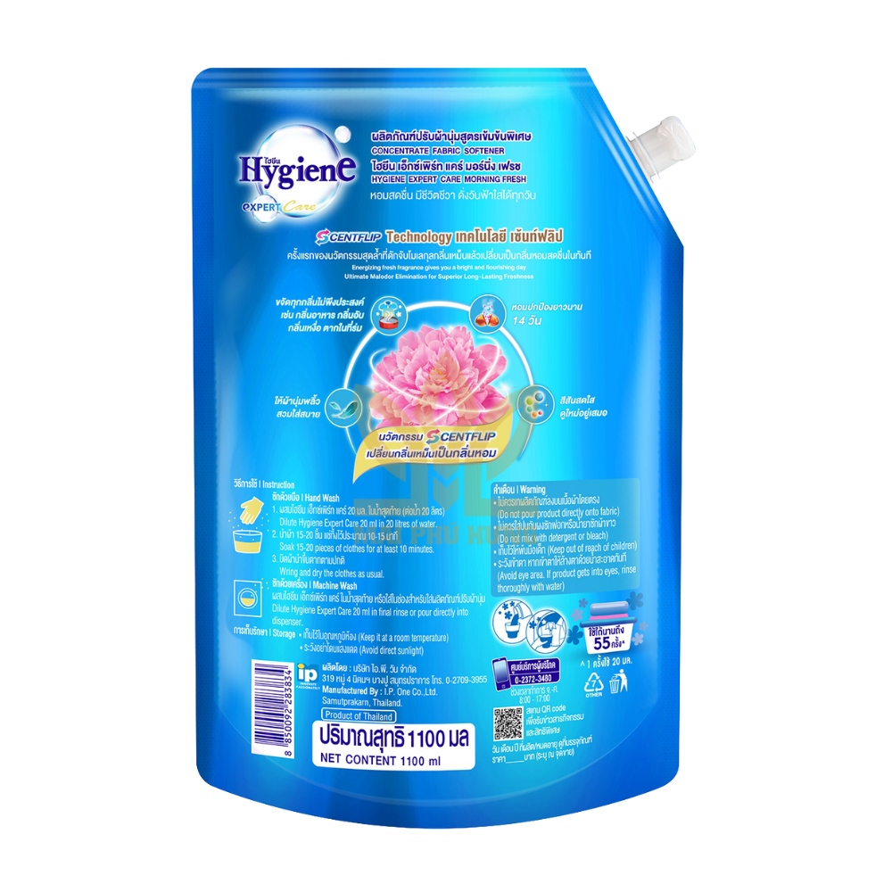 Nước xả Hygiene Expert Care Morning Fresh túi 1100ml mang đến làn hương tươi mát, sảng khoái như một ngày trời trong xanh buổi sáng. Nước xả Thái ứng dụng công nghệ Scent Flip giúp khử mùi hôi trên quần áo, bảo vệ hương thơm trên quần áo suốt 14 ngày.