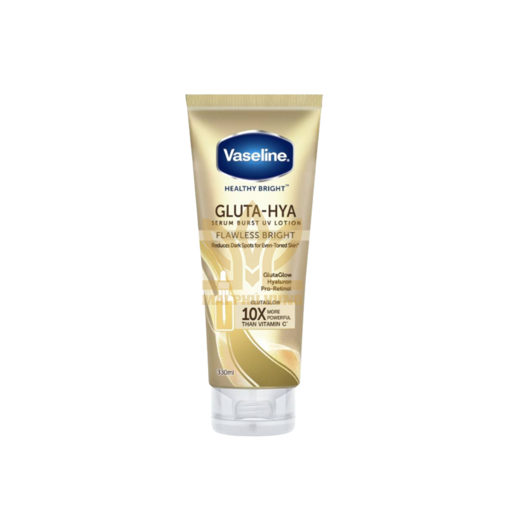 Sữa dưỡng thể Vaseline Gluta-Hya Serum Burst UV Lotion Flawless Bright 330ml bảo vệ da khỏi xỉn màu, dưỡng sáng và giữ ẩm sâu với Hyaluronic & UV filter.